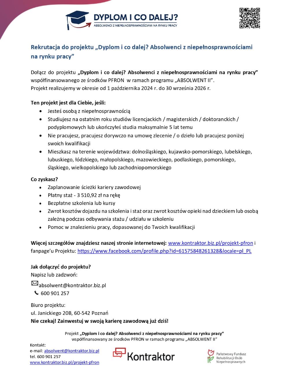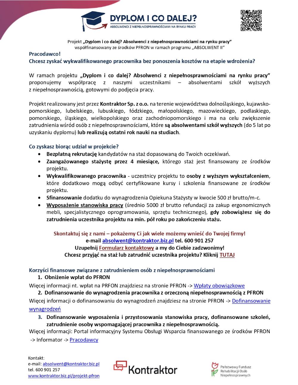 Projekt „Dyplom i co dalej? Absolwenci z niepełnosprawnościami na rynku pracy” współfinansowany ze środków PFRON w ramach programu „ABSOLWENT II” - Powiatowy Urząd Pracy w Inowrocławiu